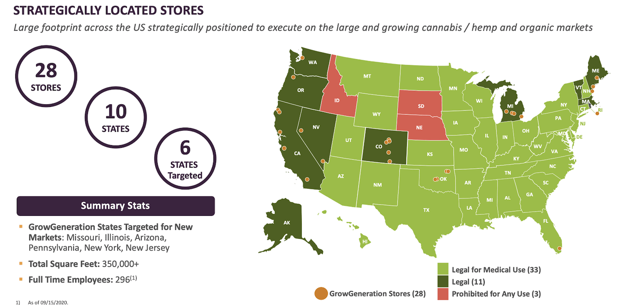 GRWG is the largest chain of hydroponics stores in the USA, with 28 stores spread over 10 states. Most of its stores are located in states which have fully legalized cannabis:
